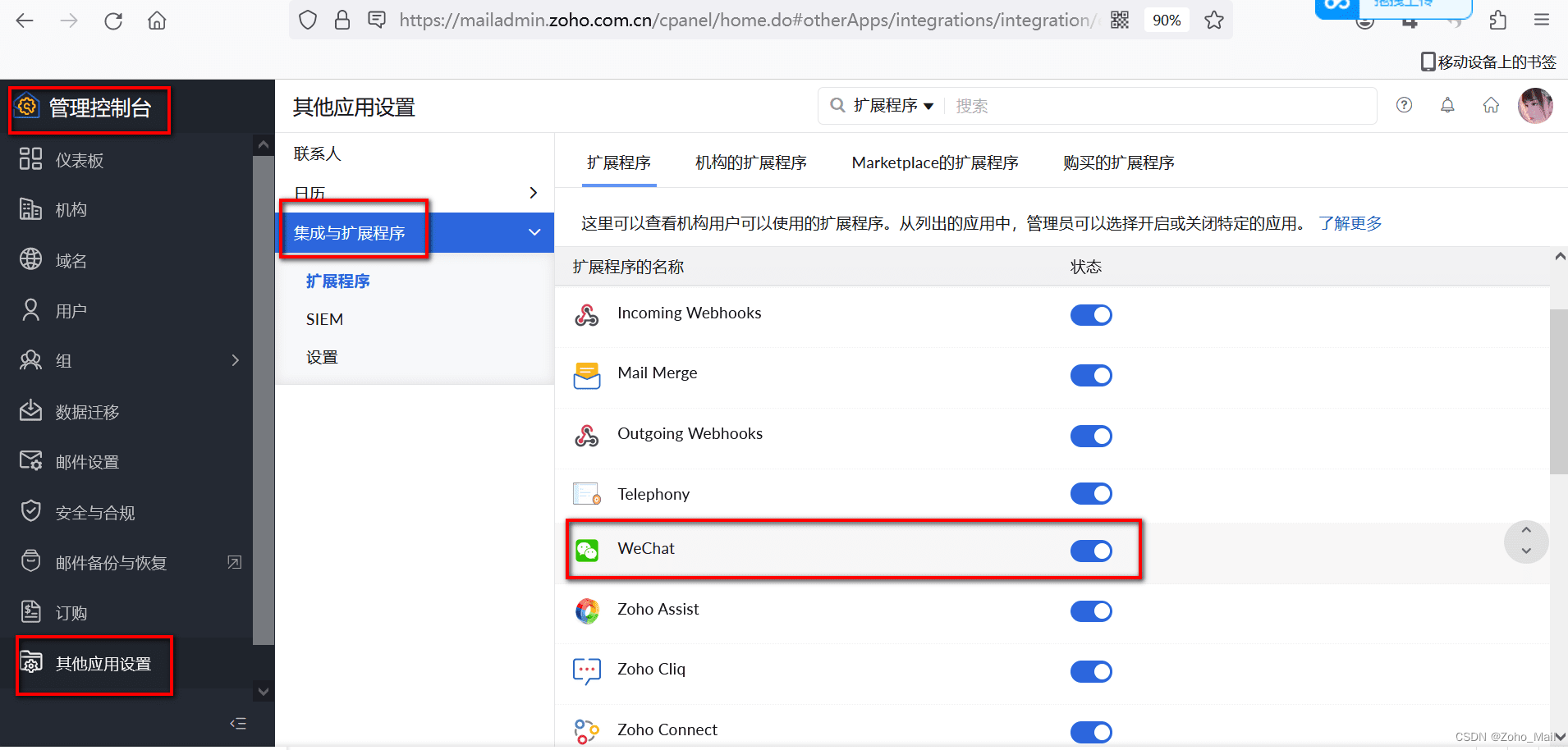 1. 企业邮箱的机构超管登录超管后台 mailadmin.zoho.com.cn-->其它应用设置-->设置集成与扩展,启用微信集成。