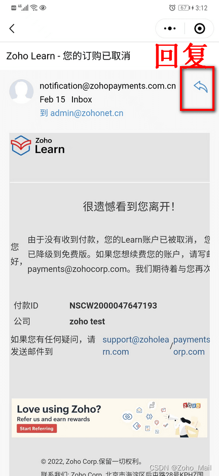 欢迎使用Zoho Mail 的邮箱微信小程序功能,如有问题请联系 support-zohomail@zohocorp.com.cn。