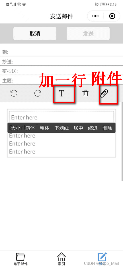 撰写邮件正文时,点击”T“图标,可添加一行内容。在该行内,可统一对字体进行简单的格式设置。也可添加手机里的文件、照片等作为邮件附件。