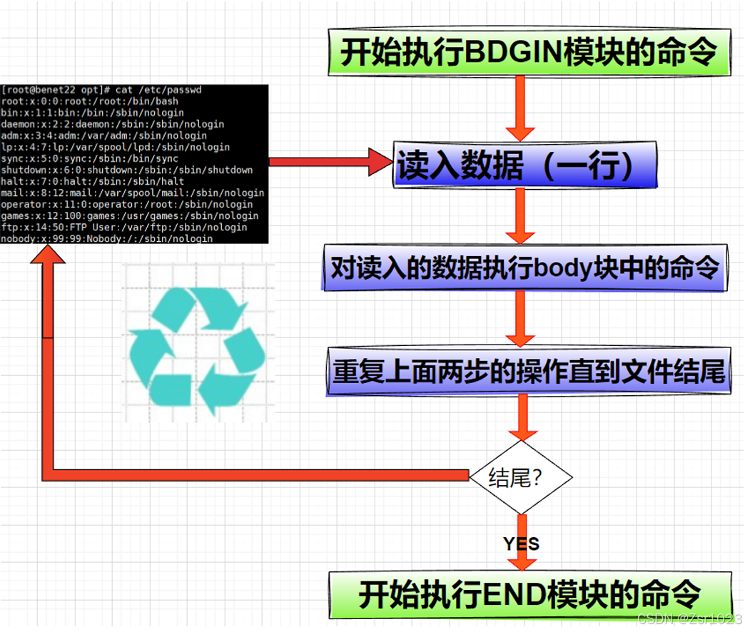 进阶技巧BEGIN 语句设置计数和打印头部信息,在任何动作之前进行 END 语句输出统计结果,在完成动作之后执行 AWK执行的流程非常简单:读(Read)、执行(Execute)与重复(Repeat)。下面的流程图描述出 了AWK的工作流程