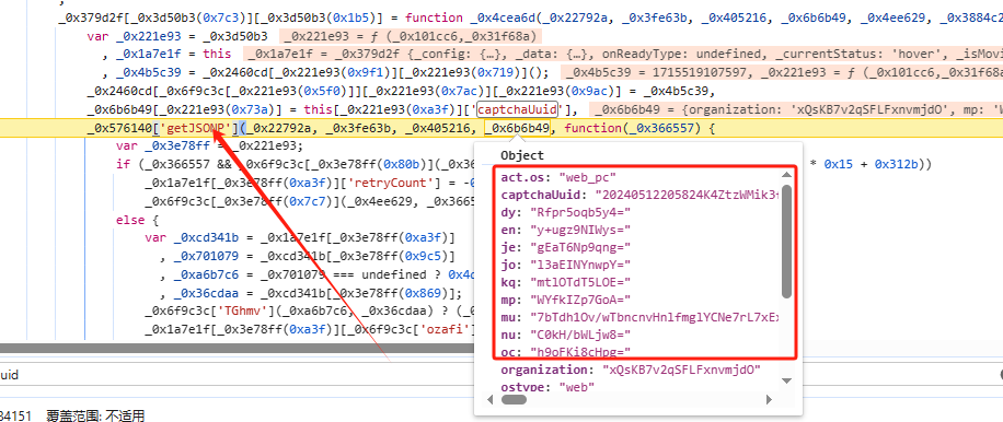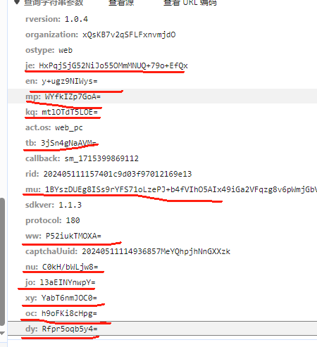下文划横线的 12个加密值都是JS返回的。不包括之前的 organization以及captchaUuid。