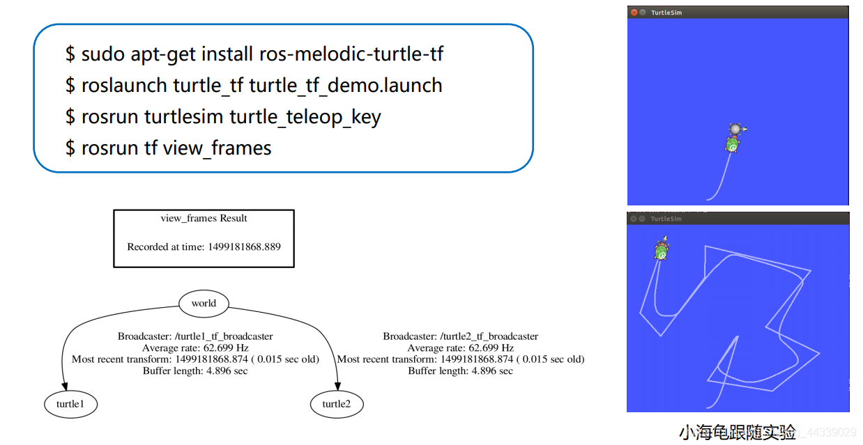 2、本部分我们要实现的内容是通过键盘控制第一个海龟移动,让另一个海龟通过TF坐标变换自动的跟踪第一个海龟