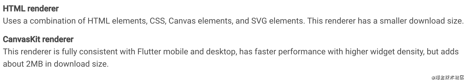 当然 Flutter 还提供了另外一种 Web 渲染能力,更接近 Mobile 和 Desktop 的 CanvasKit 渲染模式,CanvasKit 相当于是基于 WebGL 版本的 Skia 渲染,这种模式下性能肯定会更好,但是需要做的兼容和适配工作量也更大。
