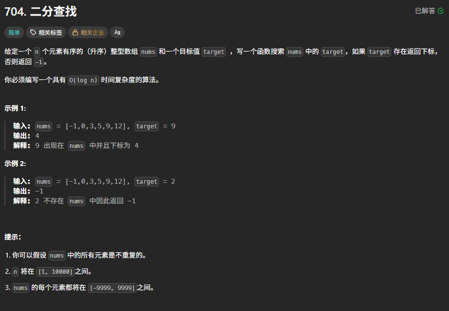 二分查找的条件是查找范围不为空,即 left≤right。如果 target 在数组中,二分查找可以保证找到 target,返回 target 在数组中的下标。如果 target 不在数组中,则当 left>right 时结束查找,返回 −1。
