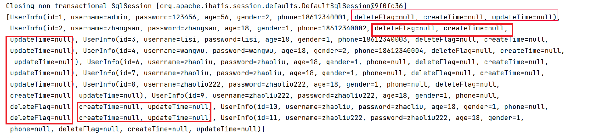 进行观察,发现,如果数据库字段和 Java 对象属性一致,就会自动赋值,如果数据库字段中,出现下划线,而 Java 对象属性中用驼峰转换了,就会出现无法赋值的情况: