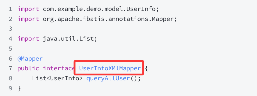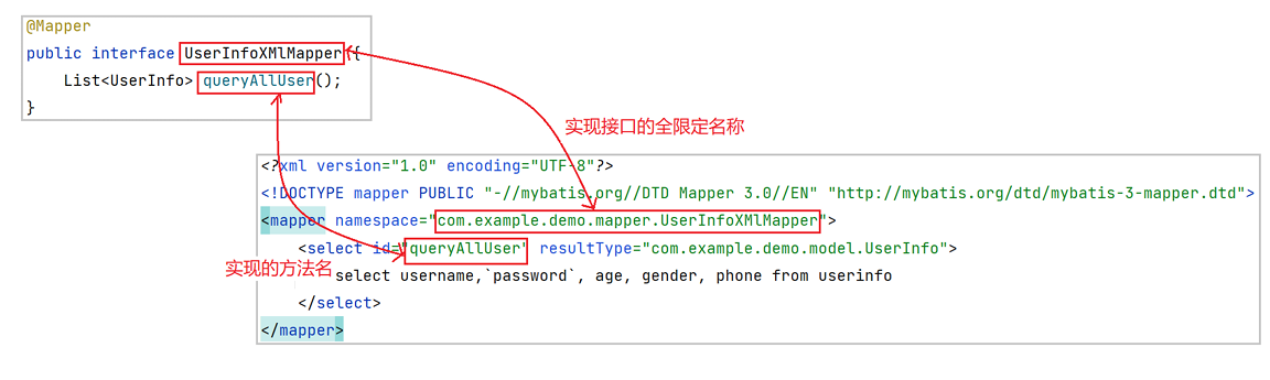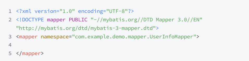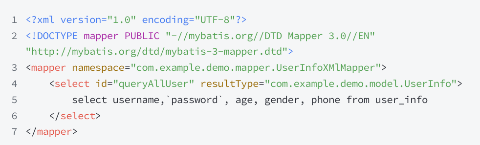 UserInfoXmlMapper.xml 中,有 MyBatis 的固定 xml 格式: