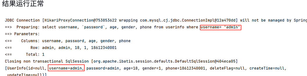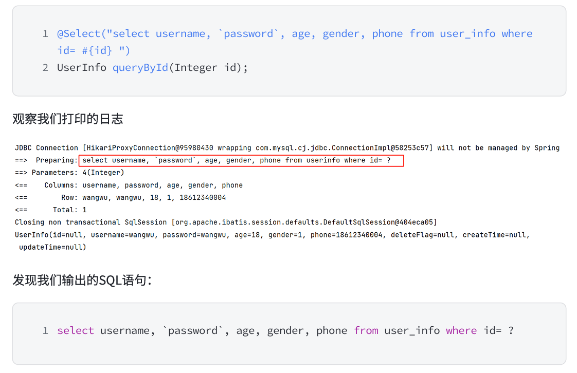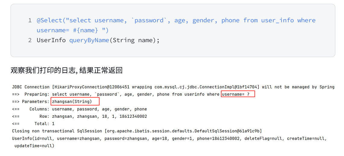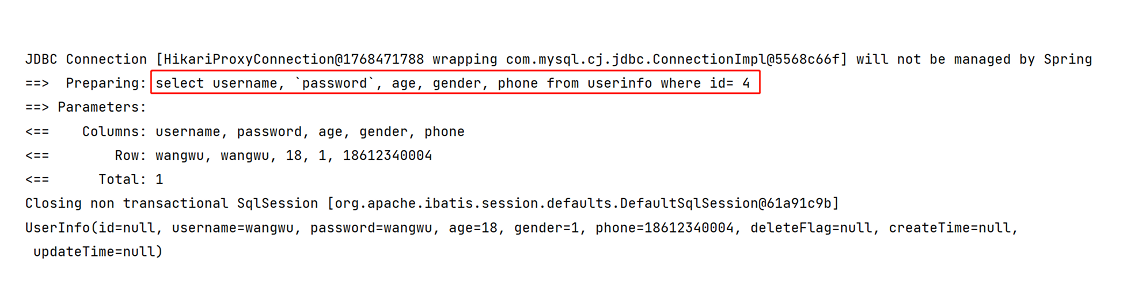 我们输入的参数,并没有在后面拼接,id 的值使用 ?来进行占位。这种 SQL 我们称之为 “预编译 SQL”