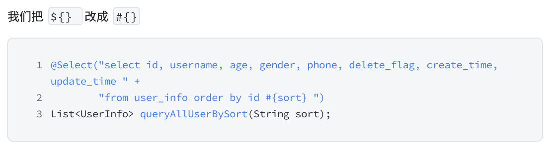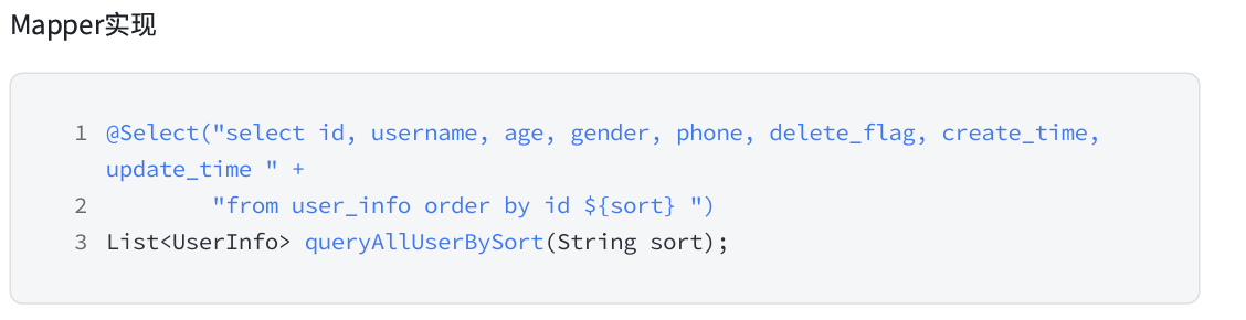 3. 一些情况下,必须使用 ${} 例如:排序功能,表名,字段名作为参数,需要使用 ${},但一定要考虑到 SQL 注入的风险,并提前进行规避。
