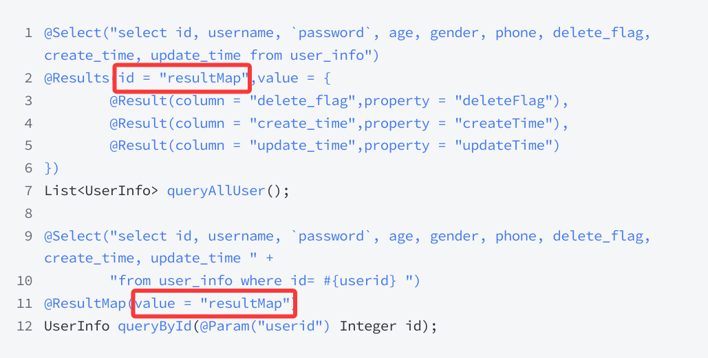 使用 Rsults 中的 id 属性来给 Results 定义别名,再使用 @ResultMap 注解来复用其他定义的 ResultMap