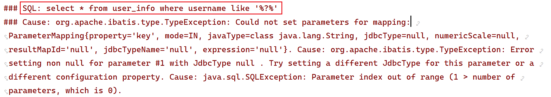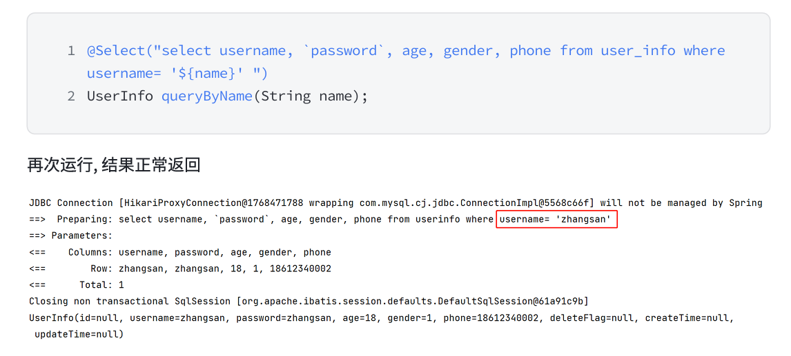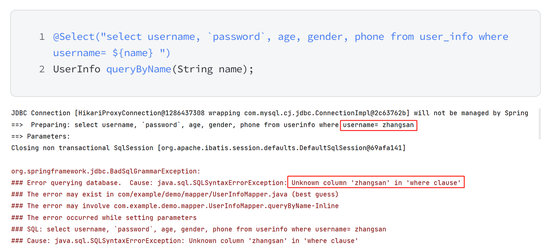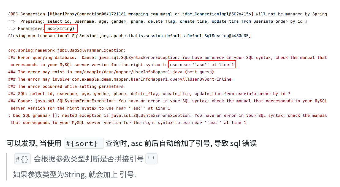 可以通过日志看到,此时的参数,是直接拼接到 SQL 语句中了,但是字符串作为参数的时候,需要添加引号 ‘ ’,当我们使用 ${} 的时候,不拼接 ‘ ’ ,会导致程序发生报错。