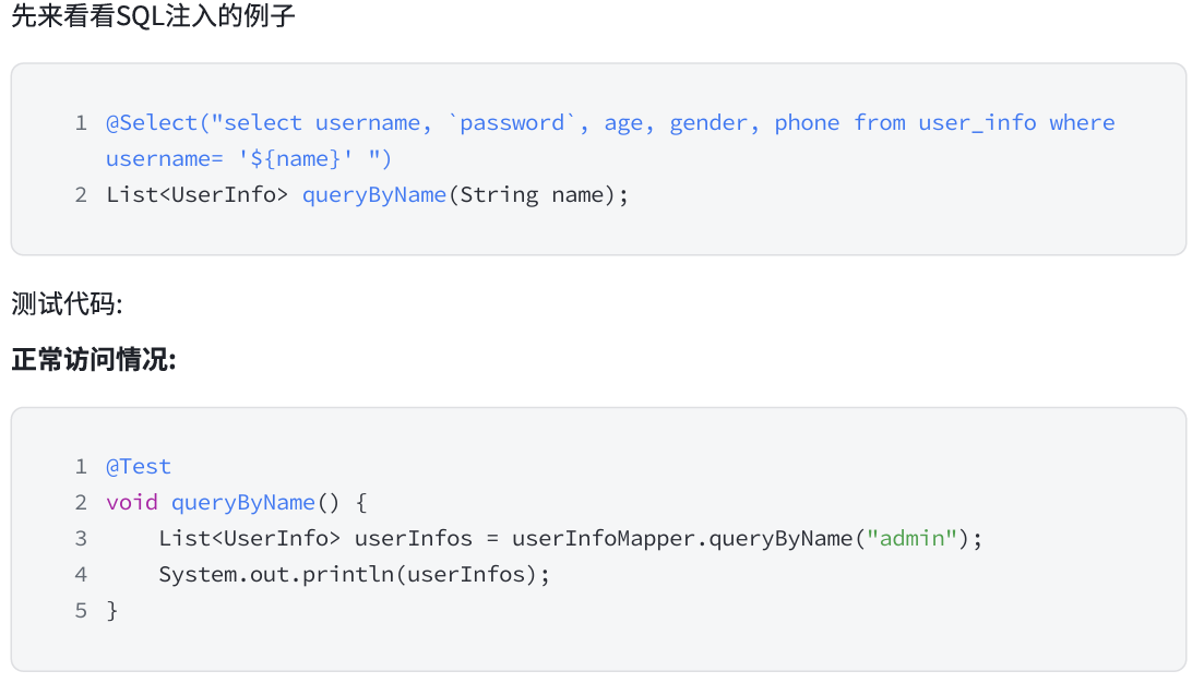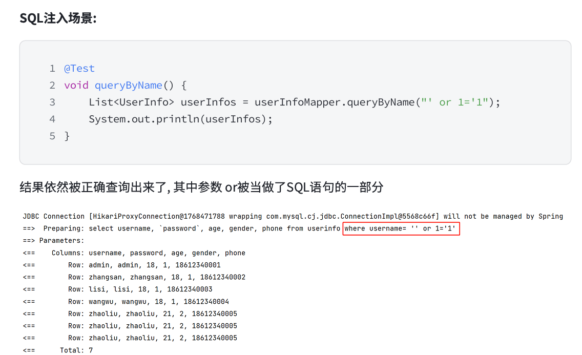 上面的区别中,我们将了 #{} 的好处,即也是 ${} 的缺点,会有 SQL 注入的风险。所以绝大部分情况下,我们尽量使用 #{} 完成 SQL 语句