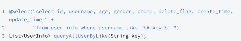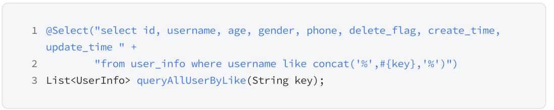 4. 模糊查询虽然 ${} 可以完成,但存在 SQL 注入的风险,通常使用 mysql 的内置函数 concat 来完成。