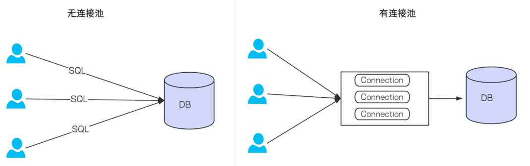 使用数据库连接池的情况:程序启动时,会在数据库连接池中创建一定数量的 Connection 对象,当客户请求数据库连接池,会从数据库连接池中获取 Connecttion 对象,然后执行 SQL,SQL 语句执行完毕之后,再把 Connection 对象归还给数据库连接池,