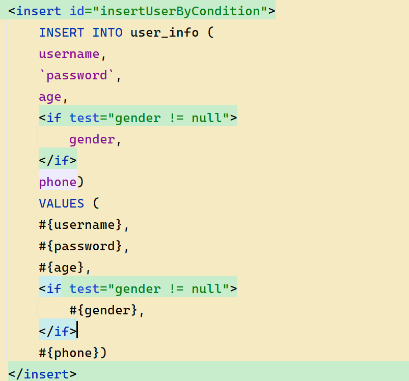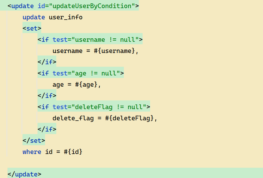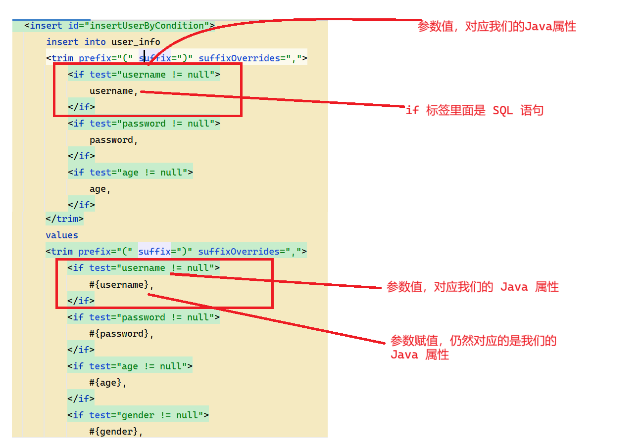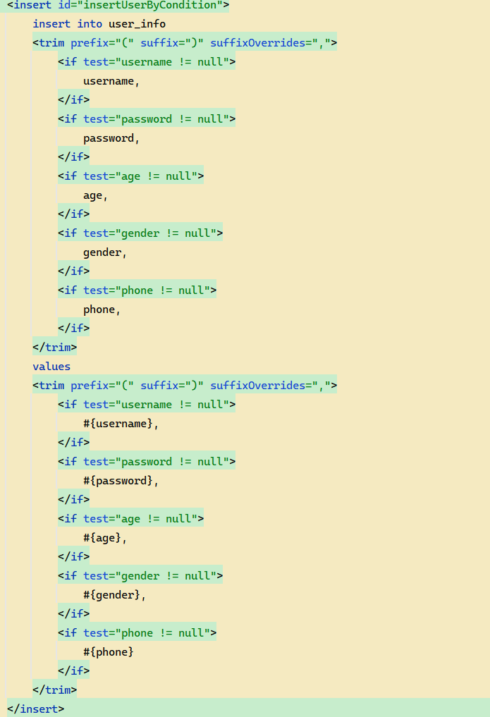 如果继续单纯的使用 <if> 会导致最后拼接完的 sql 语句多出一个逗号,所以需要结合 <trim> 标签