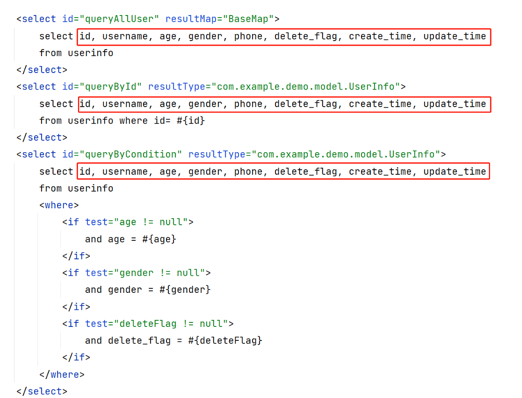 我们可以对重复的代码片段进行抽取,将其通过 <sql> 标签封装到一个 SQL 片段,然后再通过 <include> 标签进行引用。