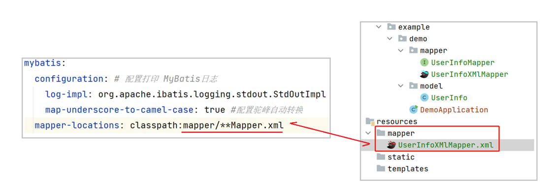 因为我们在配置文件中配置了路径,在 resources 下的 mapper 中的 **Mapper.xml