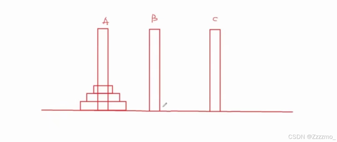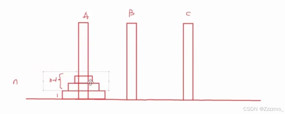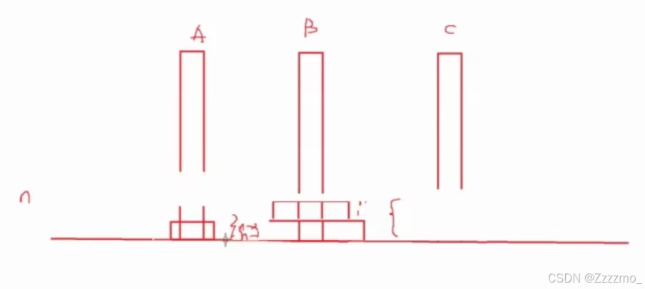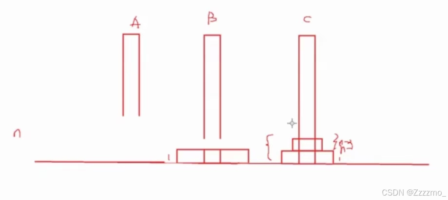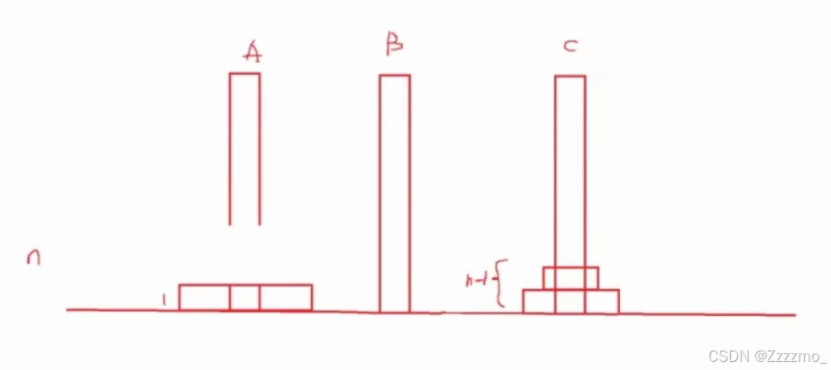 一共n个圆盘,把(n-1)个圆盘从A移到C,在把最大的圆盘从A移到B,最后把C上的所有圆盘从C移到B的过程。
