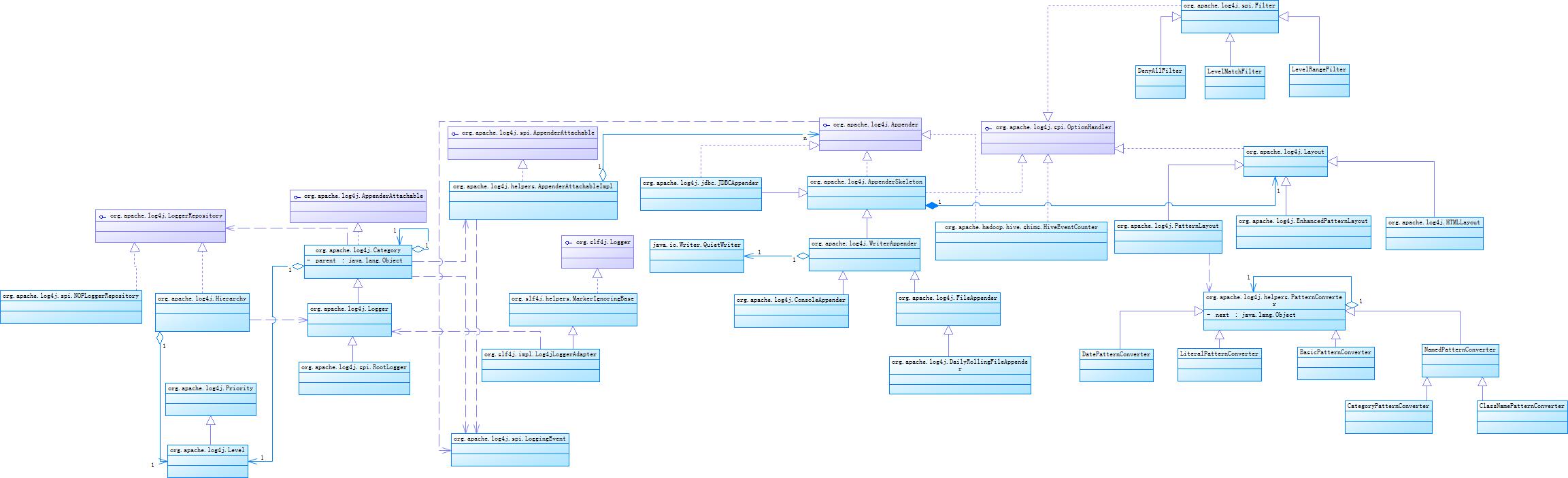 Log4J最核心的也就5个类:Logger用于对日志记录行为的抽象,提供记录不同级别日志的接口;Level对日志级别的抽象;Appender是对记录日志形式的抽象;Layout是对日志行格式的抽象;而LoggingEvent是对一次日志记录过程中所能取到信息的抽象。另外LoggerRepository是Logger实例的容器。实现Log4J主要功能相关的类图: