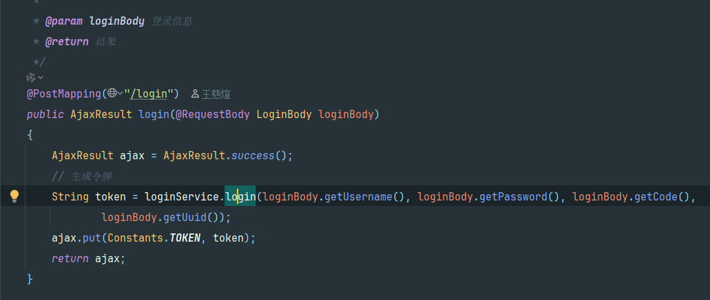最后将生成的token返回给前端。以后所有的前端请求都将携带这个token 去访问后端请求
