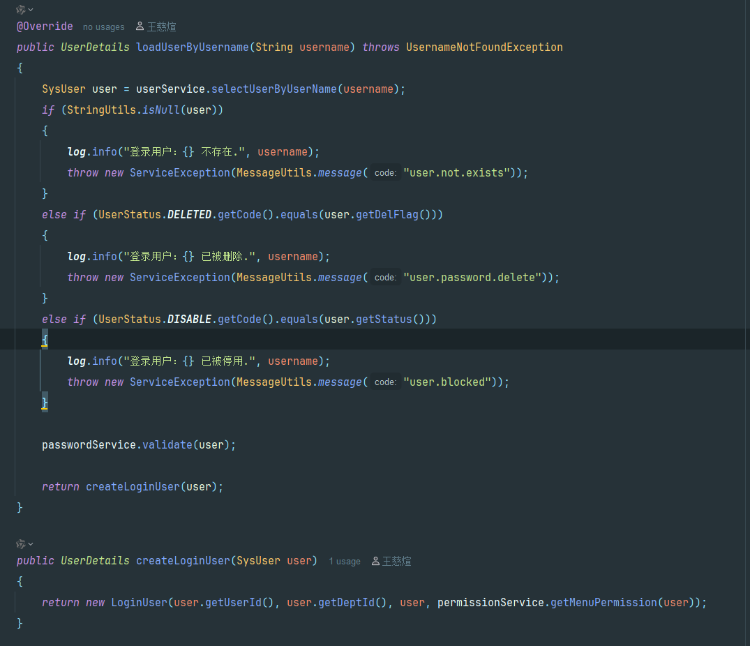 執行了以下的函數,該方法会查询数据库(userService.selectUserByUserName),检查用户状态(是否删除,停用,不存在)