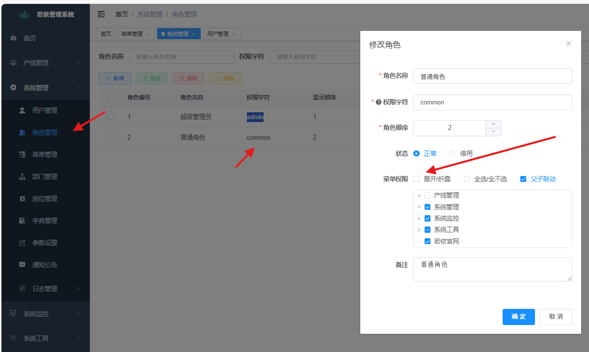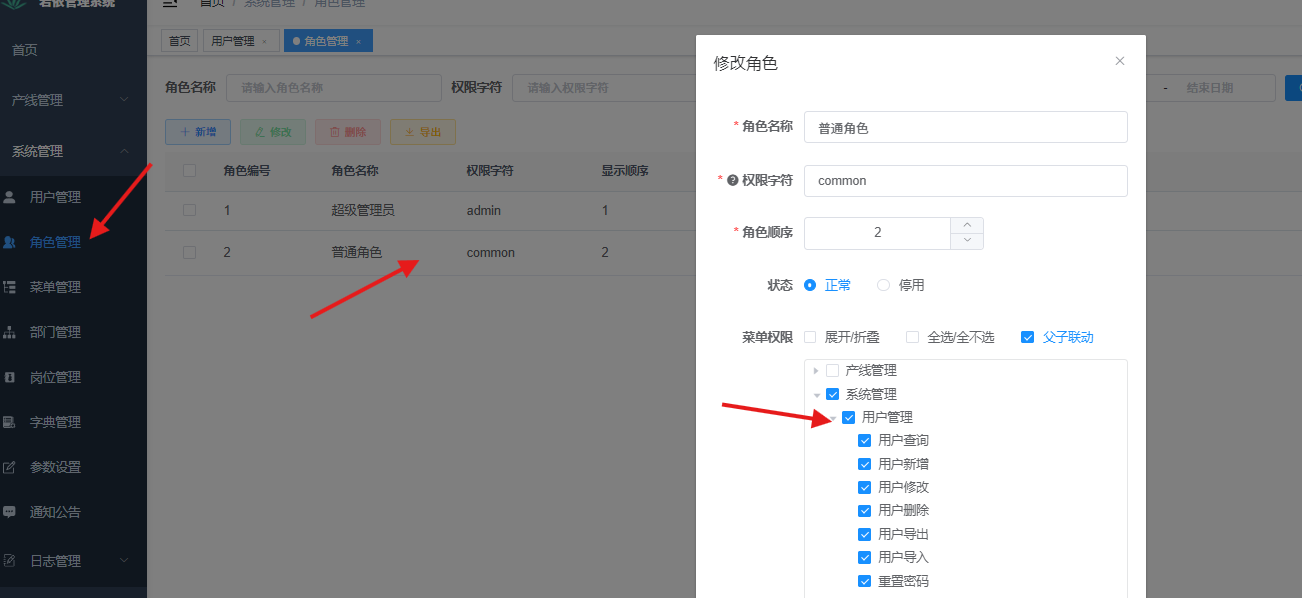 在用户管理中 可以看到每个用户有不同的角色,分为admin超级角色和common普通角色