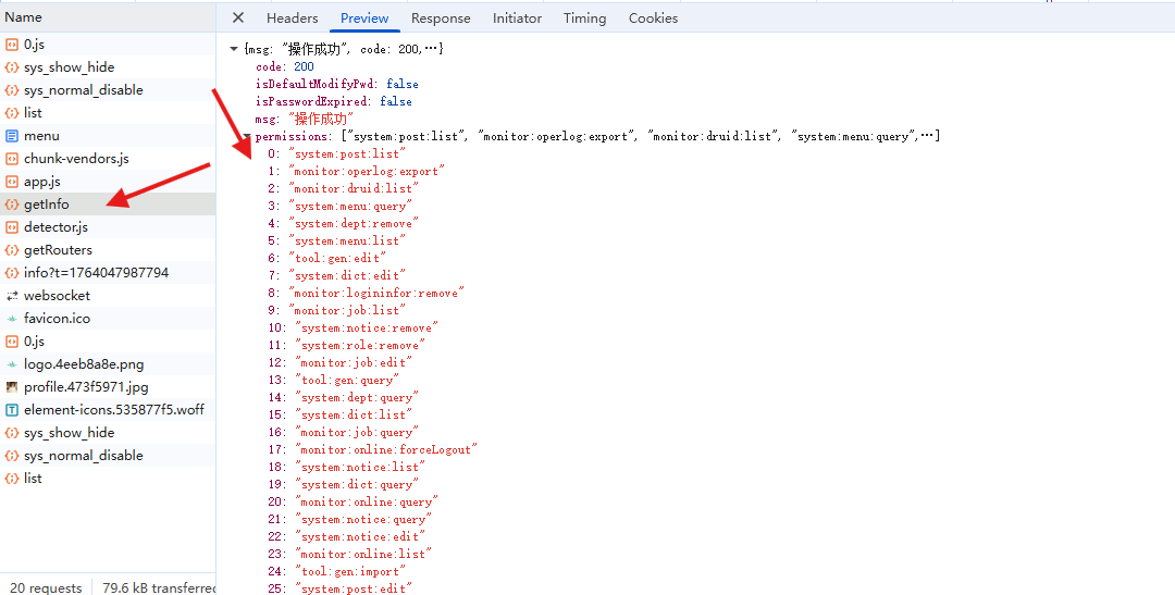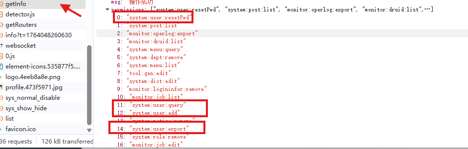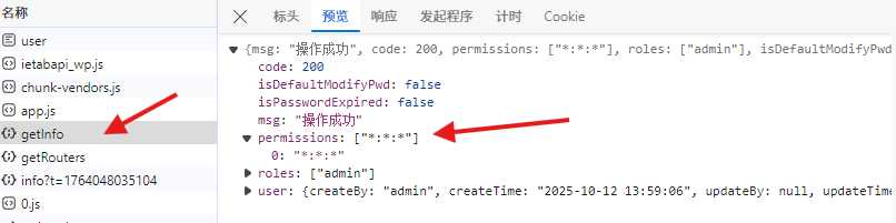 这是admin 超级管理员账号进入页面后执行的代码,可以看到它的permissions是*:* 这代表了所有的权限它都拥有.