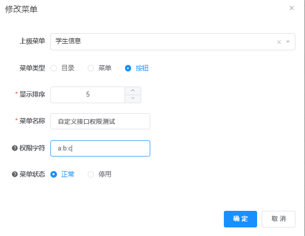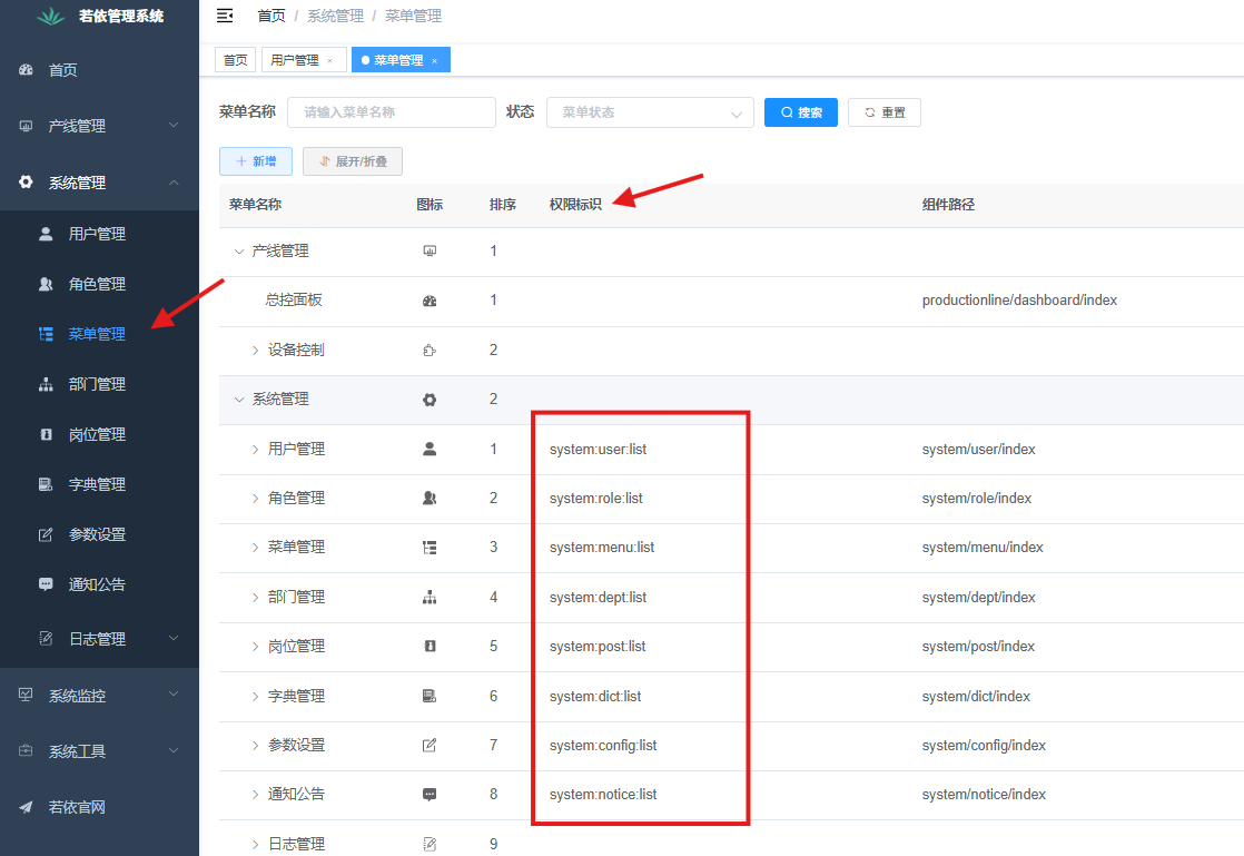进入系统管理、菜单管理里,可以看到有些菜单、目录、按钮是有着权限标识的。