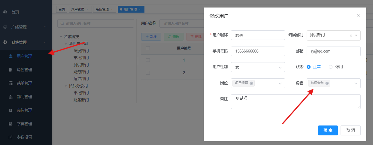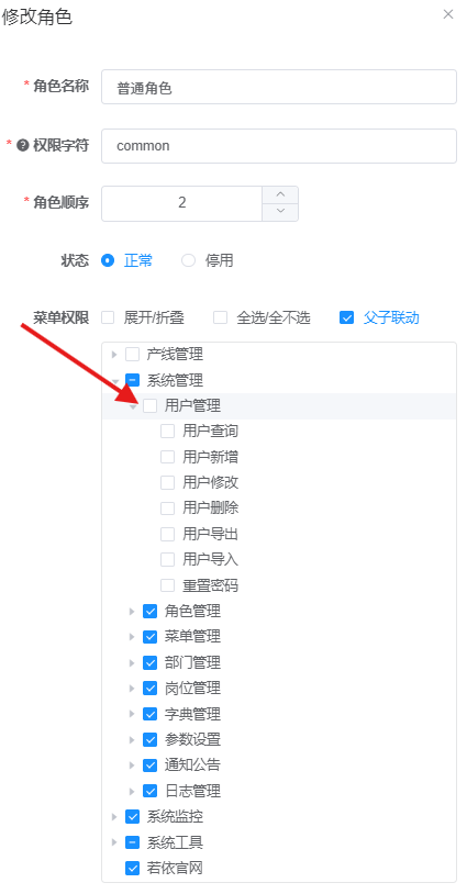 将普通角色的用户管理菜单权限去除 这样前端菜单应该不会显示用户管理 后端也无法访问用户管理的接口了