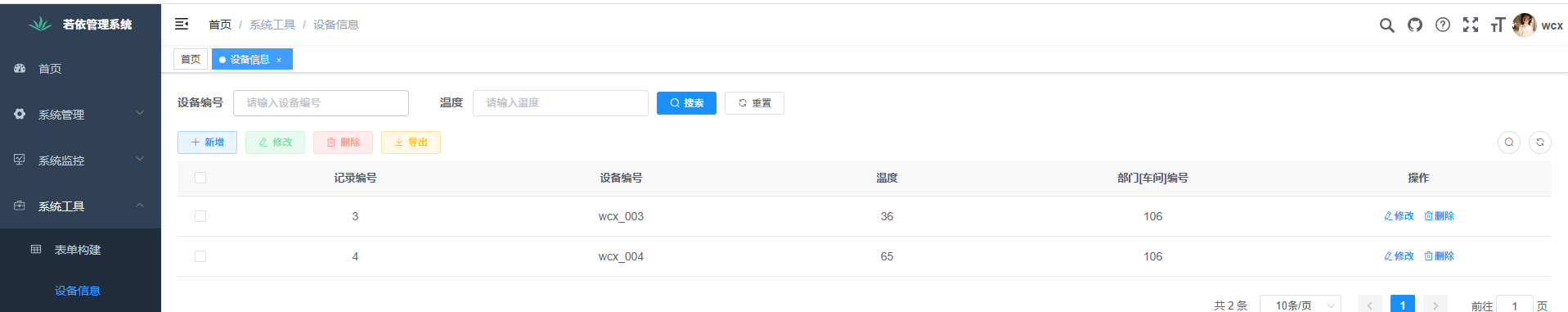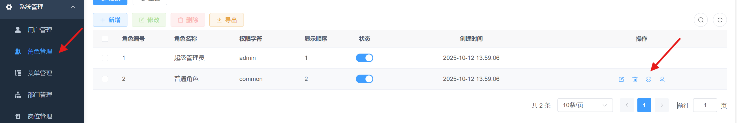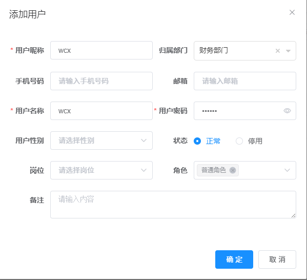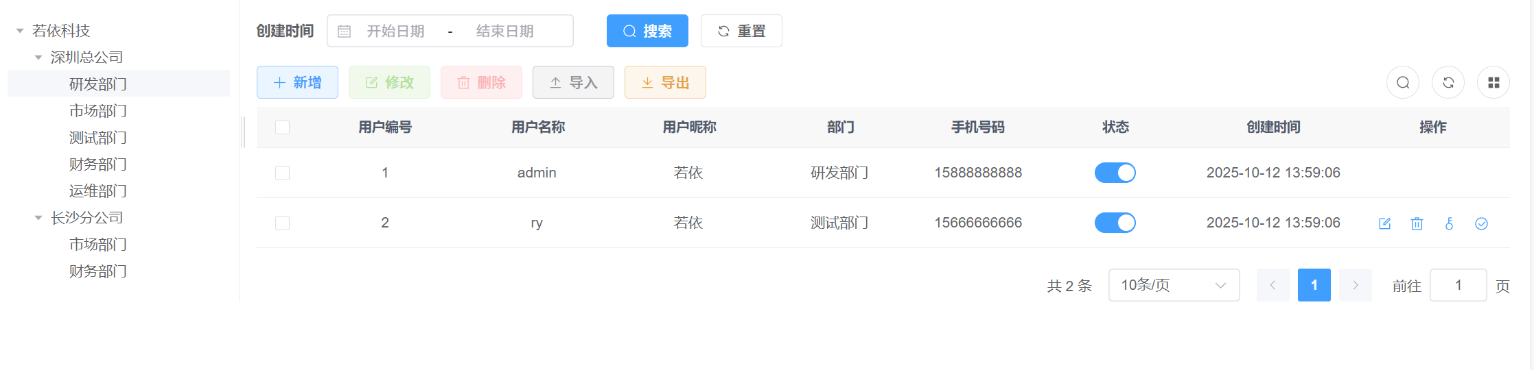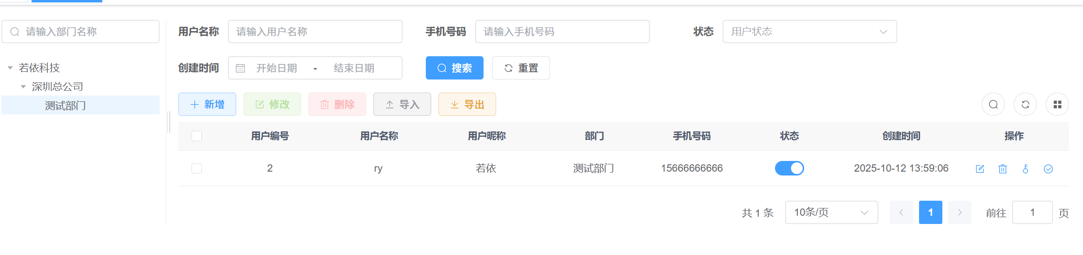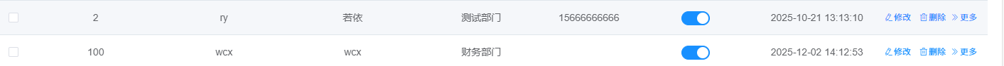 这是ry普通用户看到的用户管理,可以看到两者区别是 普通用户只能看到属于他的部门用户,而admin可以看到所有部门的用户数据。