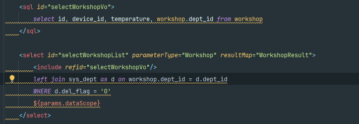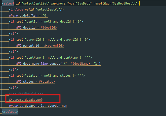可以看到sql只有 一条 那么问题来了,ruoyi他是怎么根据不同的数据权限去进行传递的呢。答案就在这个${params.dataScope}里
