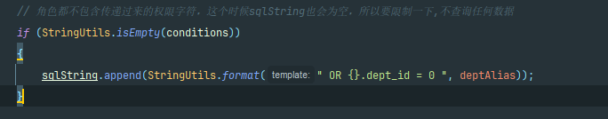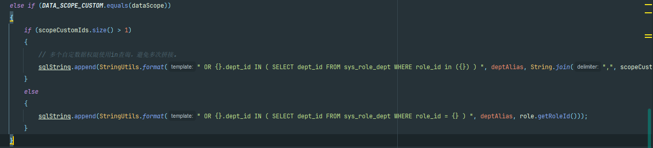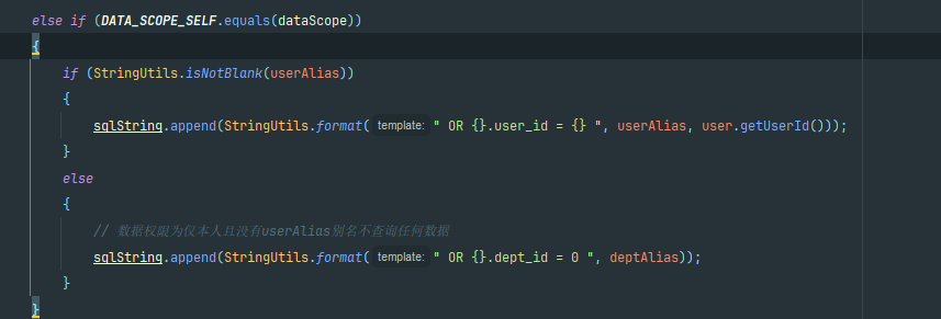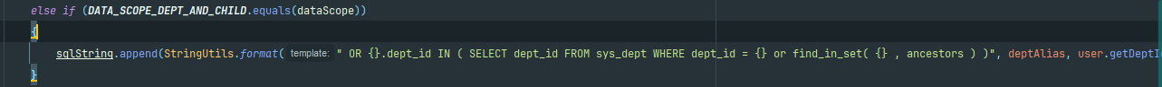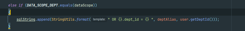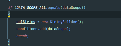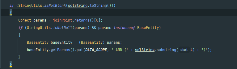 // 再包上 " AND (" ... ")" → 变成 " AND (xxx OR yyy OR zzz)" baseEntity.getParams().put(DATA_SCOPE, " AND (" + sqlString.substring(4) + ")");