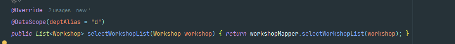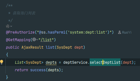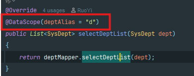这是他的service 可是看到写了一个注解@DataScope 还说明了部门表的别名为d 这个注释有什么用了,我们先往下看。