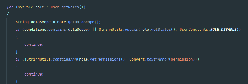 遍历当前用户所有角色,跳过已处理过的权限类型(防止重复拼接),跳过没有当前菜单操作权限的角色(比如有用户管理角色,但没“查看”权限)