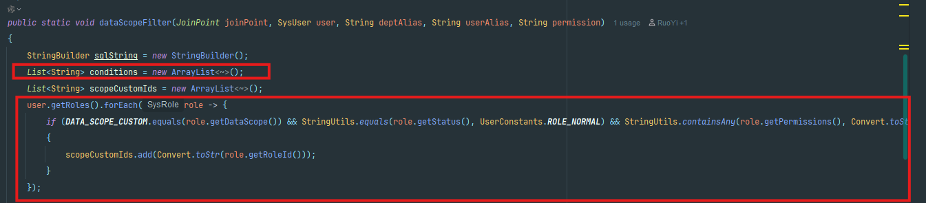 List scopeCustomIds = new ArrayList(); // 收集有“自定义权限”的 roleId(后面可能要 IN 查询)
