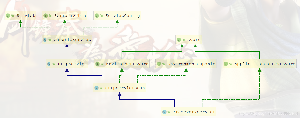 如上类图,便可清晰看到继承关系,而DispatcherServlet 继承 FrameworkServlet 抽象类,FrameworkServlet 又继承 HttpServletBean 类。web容器启动的时候会调用 HttpServletBean 的init方法,这个方法覆盖了GenericServlet中的init方法。源码如下: