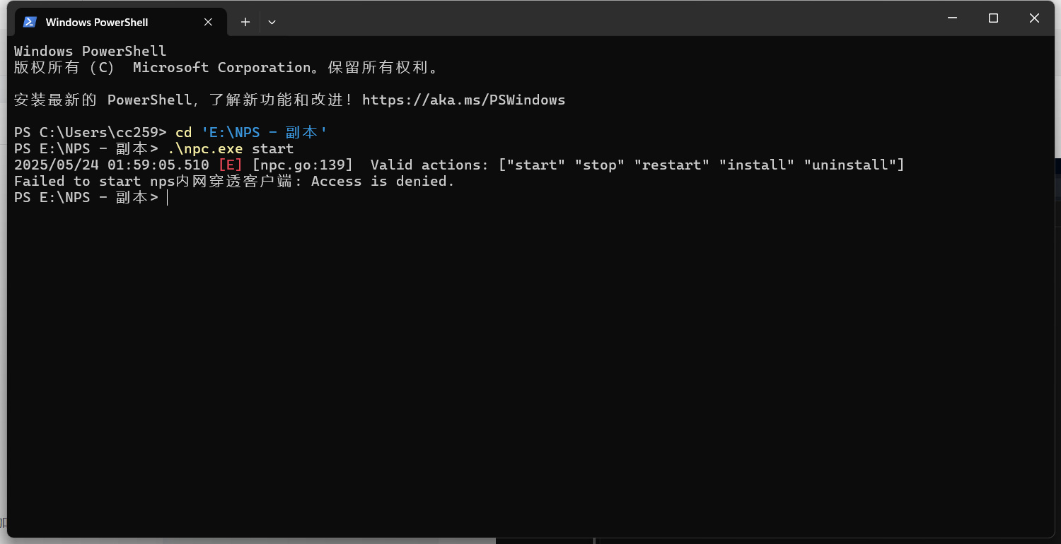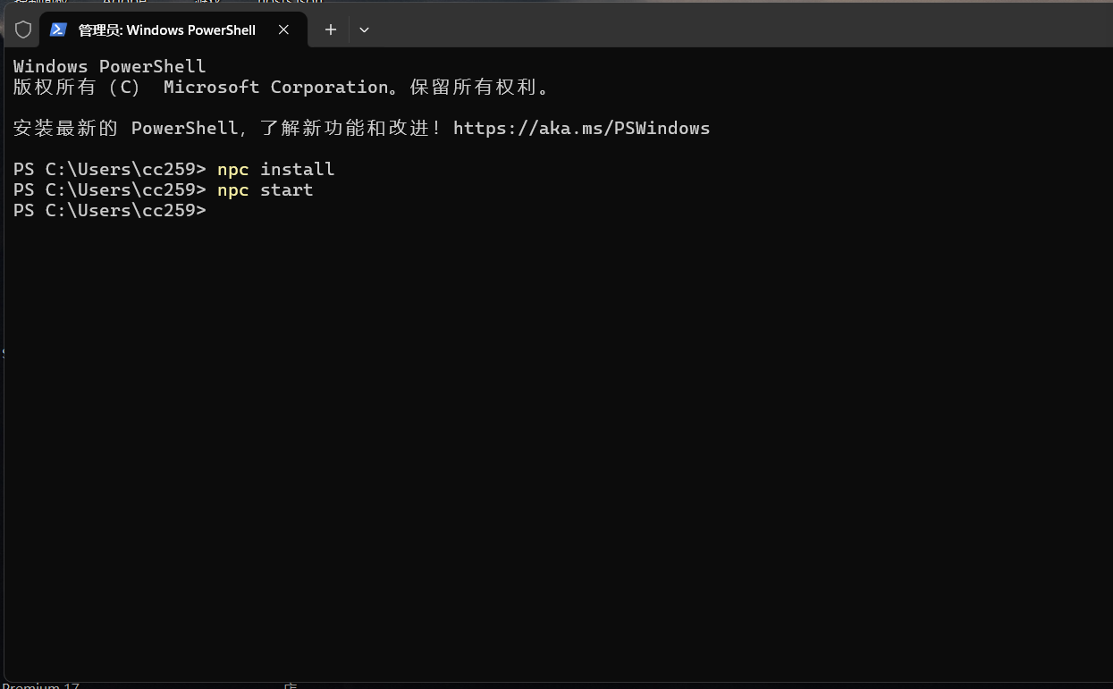 输入cd '你的目录',进入到npc的目录里面,再输入 .\npc.exe start 这个命令能够安装到电脑c盘里面,也可以先执行.\npc.exe install再执行安装
