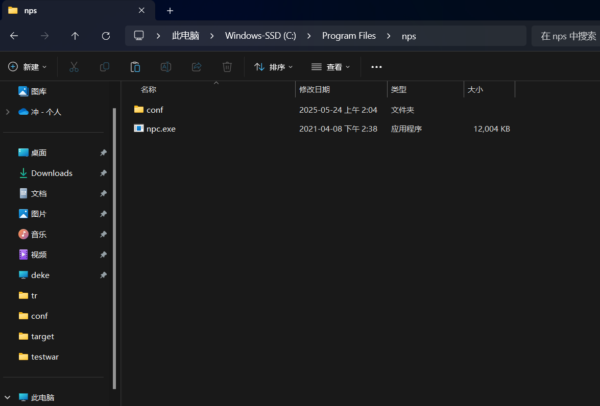 也有可能没报错,也安装失败,那我们来手动安装,先创建这个路径C:\Program Files\nps然后把nps文件包含配置文件,全部复制进来