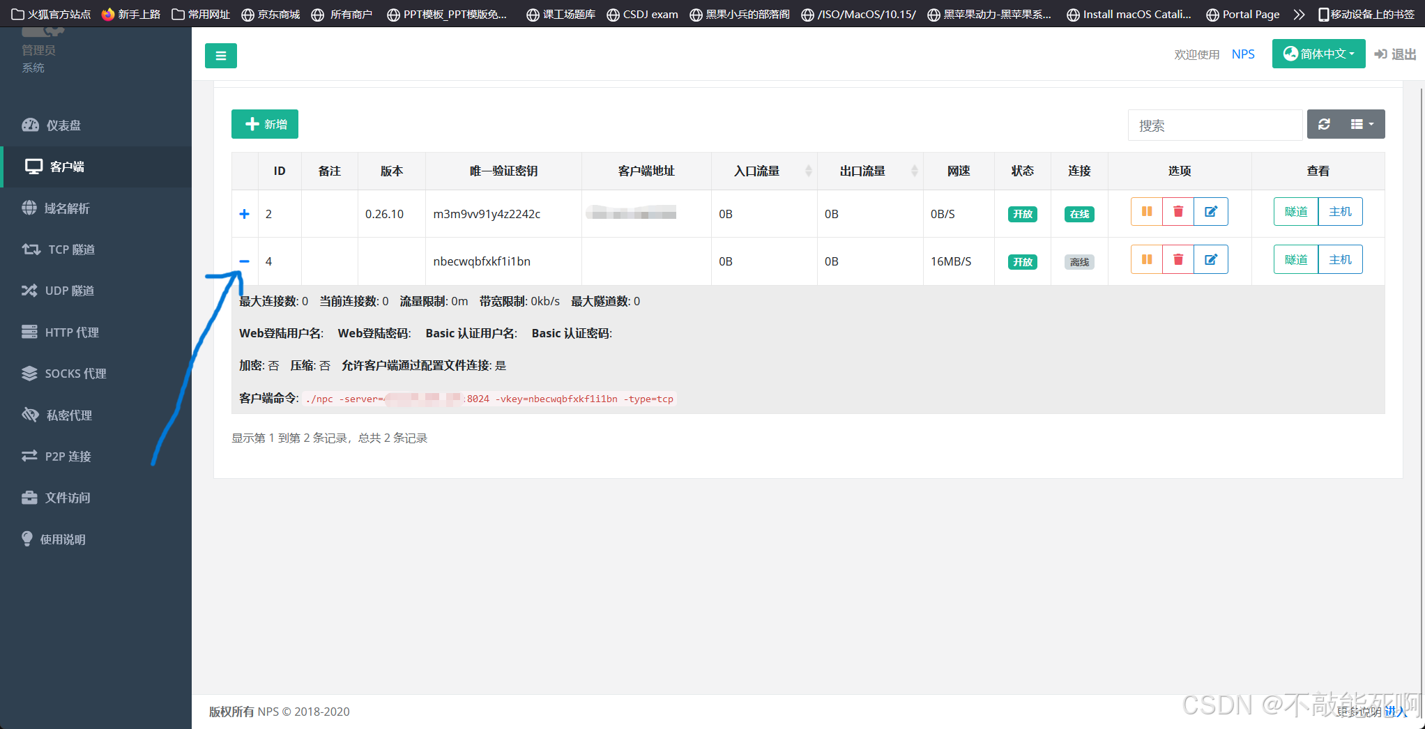 第四步、可以看到下面是一个示例,把上面复制到的网址放到第二行server_addr的值,密钥放到第四行vkey的值,其他的不重要,这样就已经可以使用了,我们打开上面目录的npc.exe即可启动,我们就可以看后台的客户端是否显示在线,显示在线客户端的配置步骤已经基本完成
