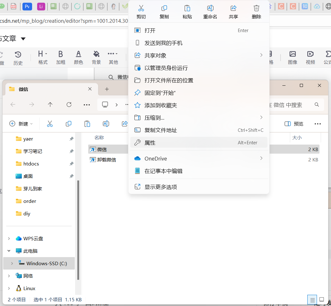 第二步,在打开的文件夹里鼠标右键点击微信快捷方式,然后点击“属性”