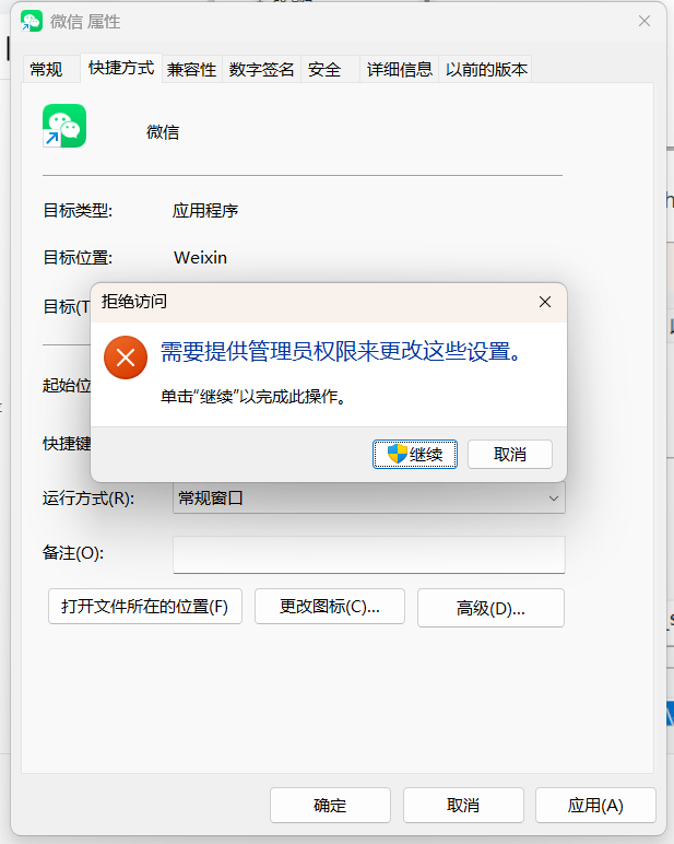第三步,在属性窗口中把“目标”这一栏里的“WeChat”字样都改成“Weixin”,然后点击“确定”,在“拒绝访问”这个弹窗里点击“继续”按钮