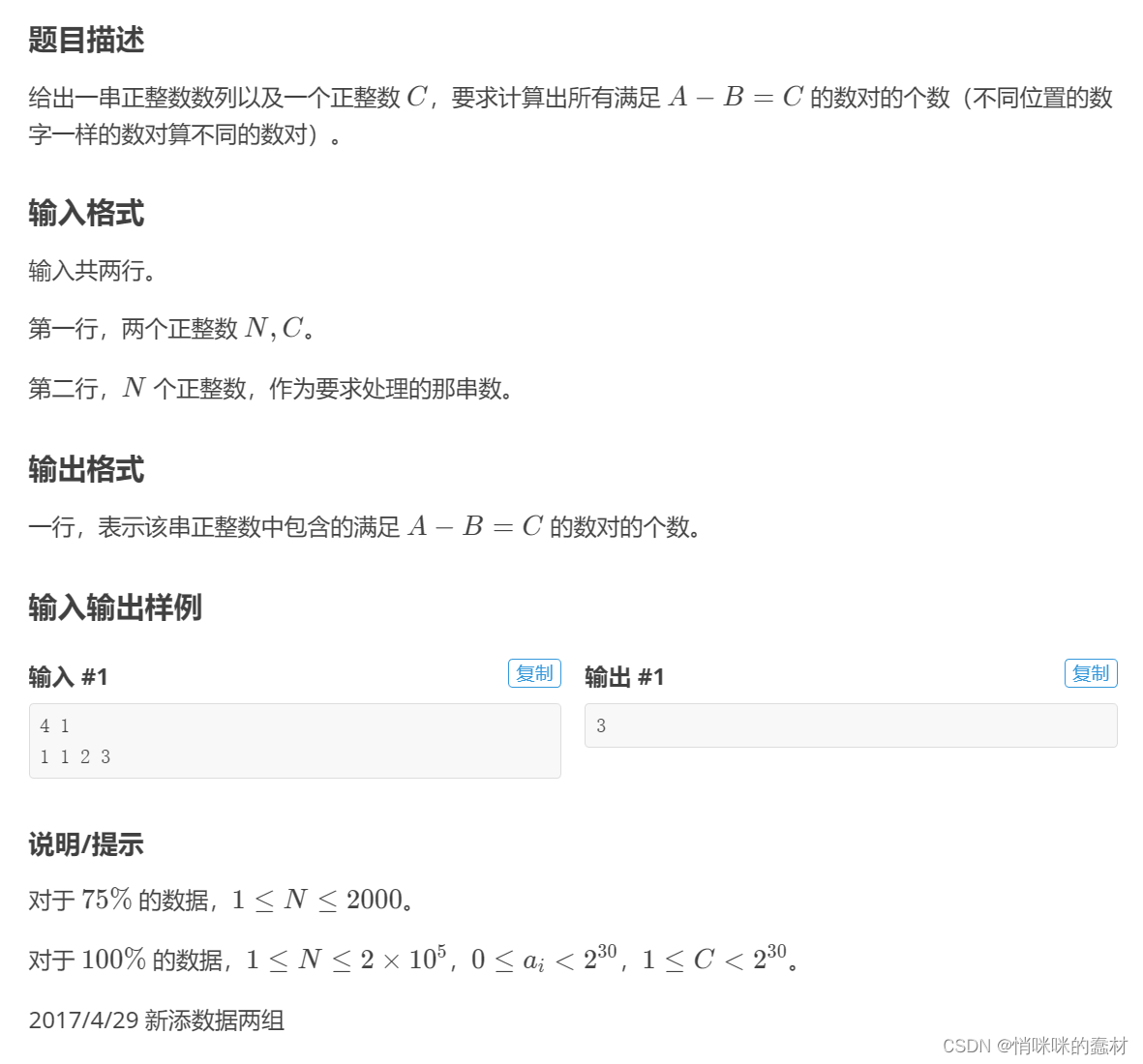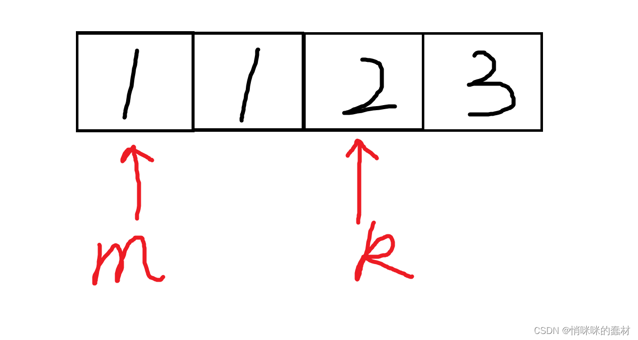 以题中的A=2为例子,因为C=1,所以我们要定位A-C的差,也就是1的位置,那么有几个1,就有几个(2,1,1)(对应A,B,C)的数对。我们定义两个指针 m 和 k。m指向大于等于B的第一个数字,k指向大于B的第一个数字。那么,[m,k)中都是1,也可以写成[m,k-1]的形式。因而k-m便得到了1的数量,即(2,1,1)的数量。