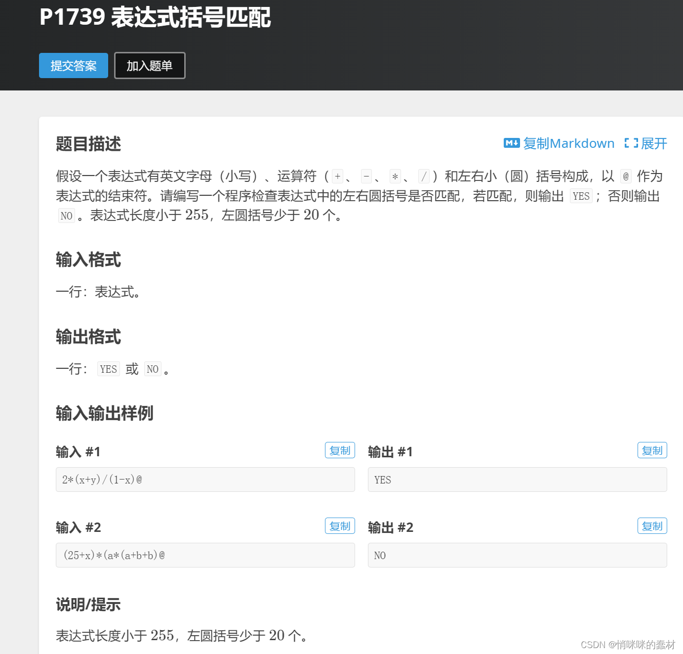 当遇到(时,(入栈,遇到)时,(出栈,以和)对应匹配。在遇到)前需要先判断一下栈是否空,如果为空,则无匹对的(,直接输出NO。最后,判断栈是否为空,也就是是否()全部匹配好,如若空,则YES,否则NO