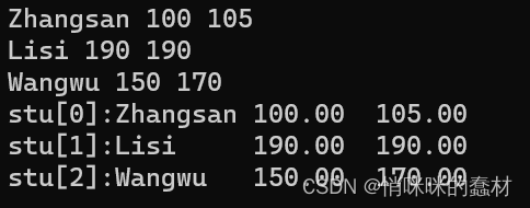 printf("stu1:%s\t%d\t%.2f\t%.2f\n", stu1[4].name, stu1[4].age, stu1[4].weight, stu1[4].height);