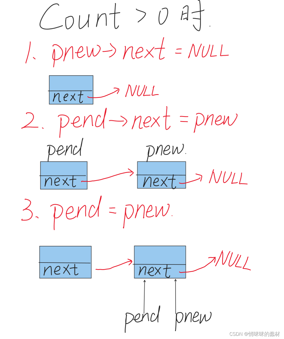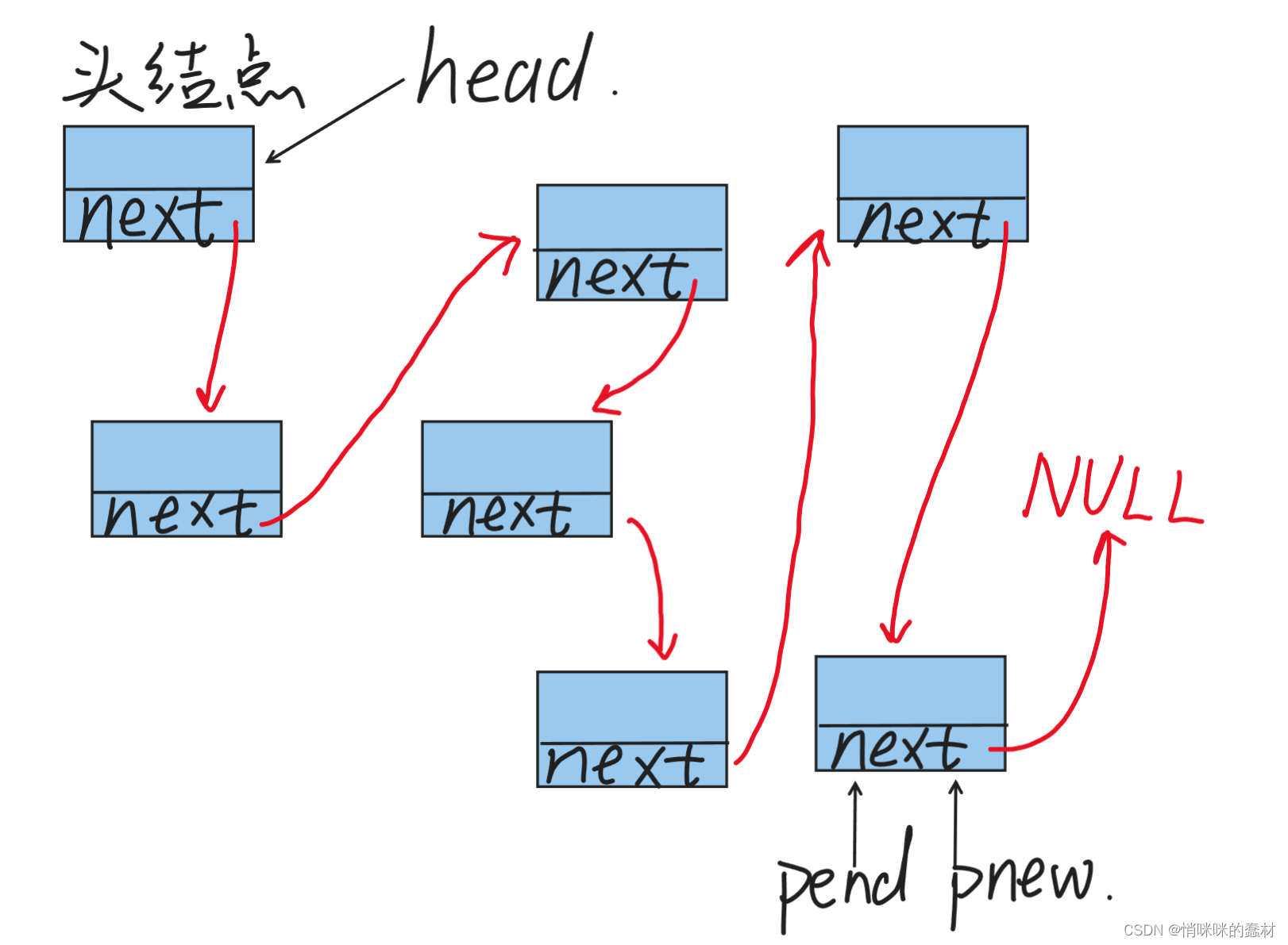 由附图二我们可以看出,pend移动之后,上一个节点的地址将会丢失,当前节点变成旧节点,以便为了继续连接新的节点。因此在链表被完全创建完之后,pnew以及pend会指向最后一个节点,head依旧指向头节点,没有变过。