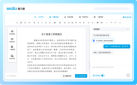 大型机构行文需保持统一、专业的风格。蜜度模力通的“AI风格仿写”功能,能够深度学习指定的优秀范文,精准复刻其结构、用词与文风,辅助新文件撰写,有效解决了新人上手慢、团队输出质量波动的问题。对一致性的追求使其超越了基础写作辅助,上升为团队知识管理与能力沉淀的工具。