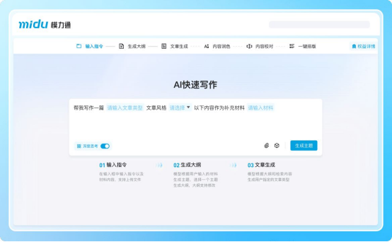 面对突发任务,从零搭建文章框架耗时费力。蜜度模力通的“AI快速写作”功能提供了不同思路:用户输入一句话指令,系统即可智能解析意图,自动生成逻辑清晰、层次分明的文章大纲与初稿,为写作提供了一个高质量起点,将创作者从基础构思中解放出来,专注于核心观点的深化。