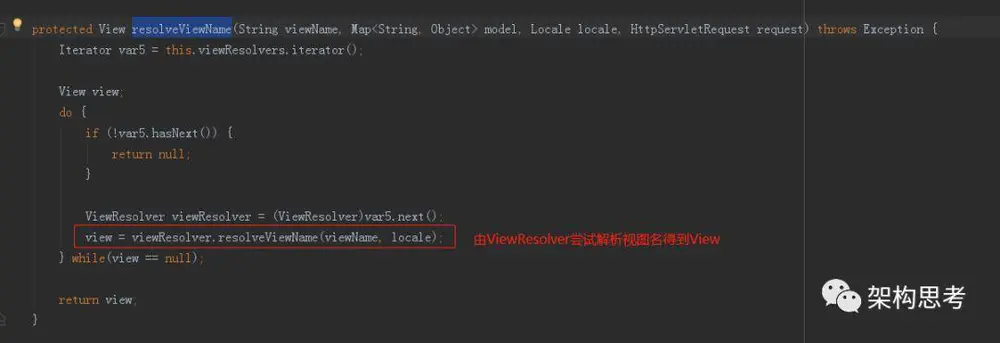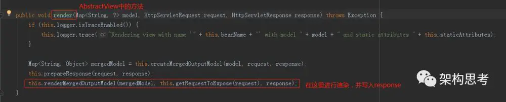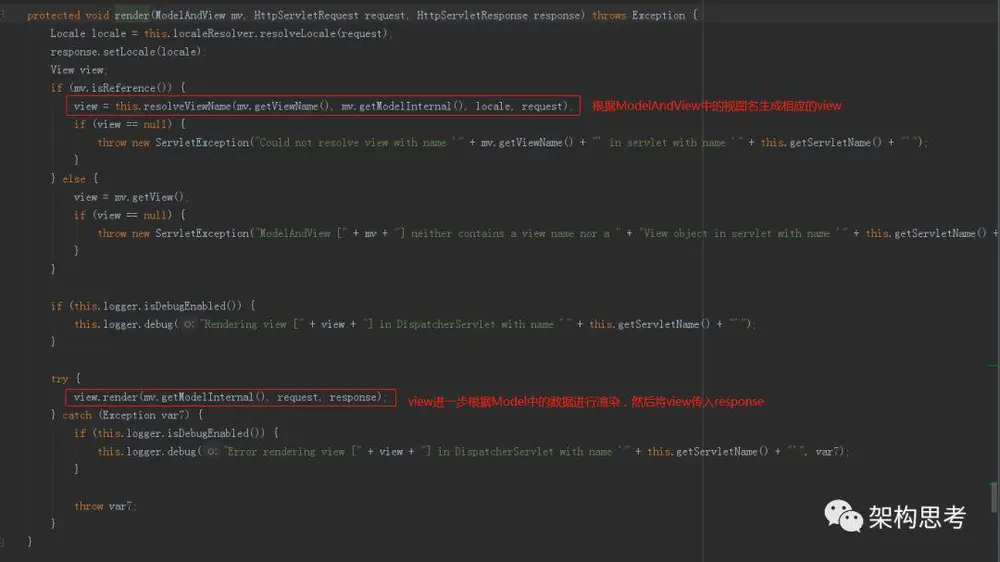可以看到,经过层层调用,最终由ViewResolver(DispatcherServlet持有一个ViewResolver列表)根据ModelAndView中的viewName解析出View对象,View对象再根据ModelAndView中的Model对View对象进行渲染(说白了,就是将Model中的数据填充到View对象中)。