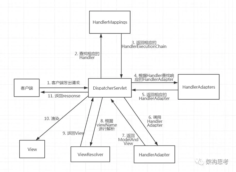 从图中可以看到,DispatcherServlet是持有一堆HandlerMapping的,一个HandlerMapping是对一个URL和一个Handler的封装,并且HandlerMapping中的handler并不一定就是handler对象,也有可能是handler的名字。如果只是handler名,则从applicationContext中拿对应的Handler。