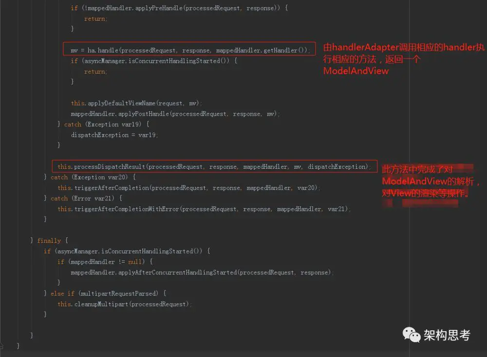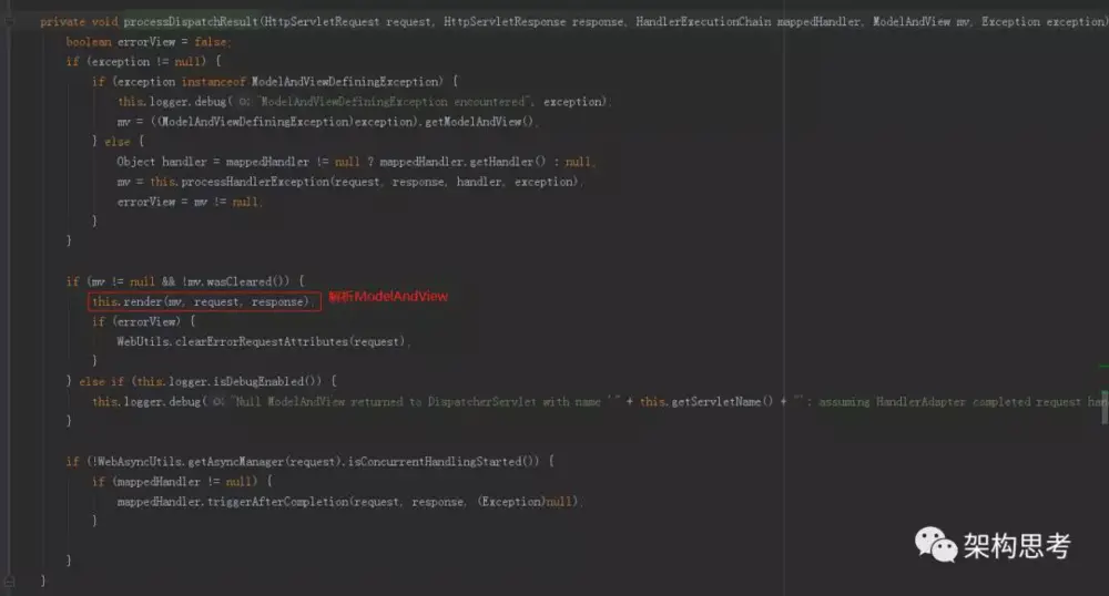 总之,最后会拿到一个ModelAndView,ModelAndView在processDispatchResult方法中被处理。下面四张图是按照执行顺序给出的各个方法的源码。