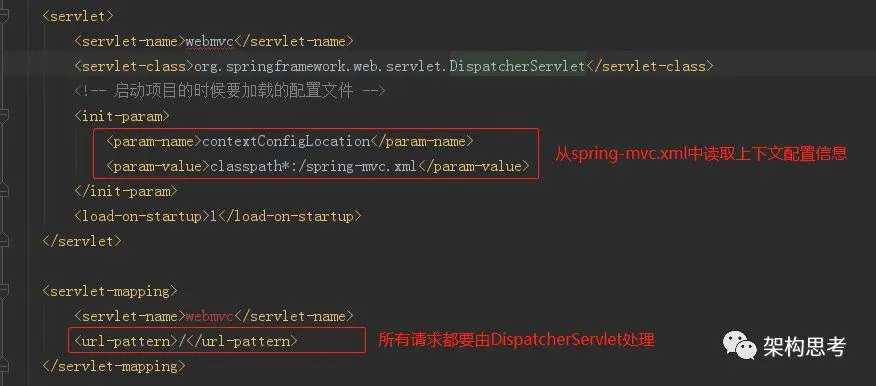 SpringMVC在启动时,首先要读取web.xml文件,读取关于DisptcherServlet的配置,如下图所示。这里配置了哪些请求要走DispatcherServlet,配置了从哪里读取上下文配置信息。